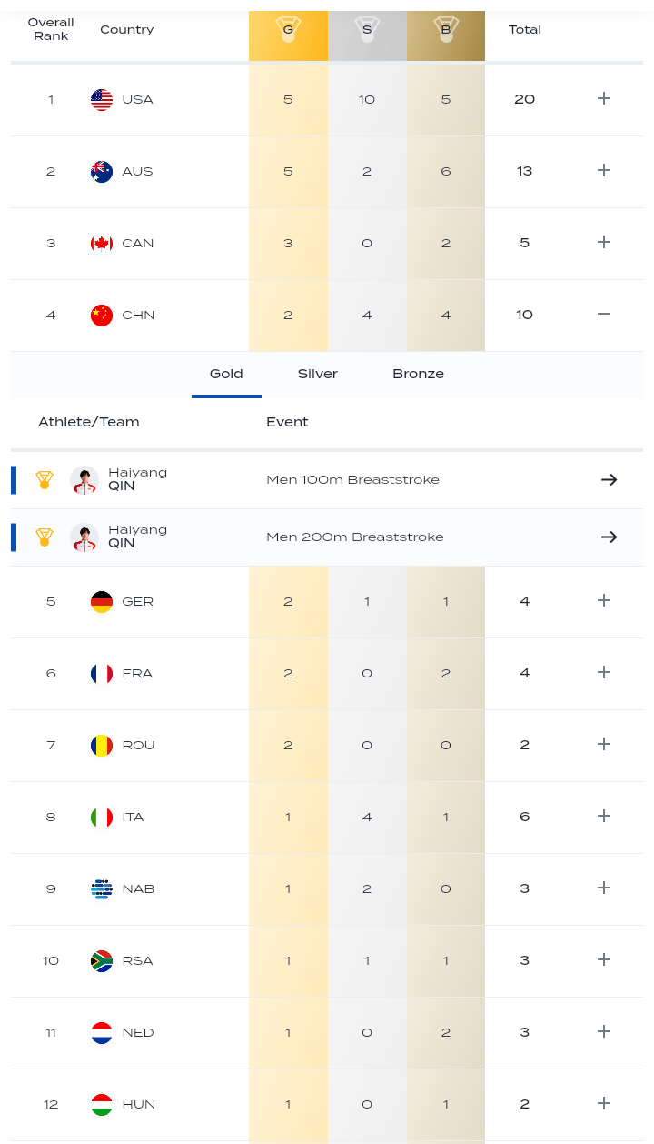 50米蛙泳决赛,覃海洋游出26秒67,成绩铜牌。