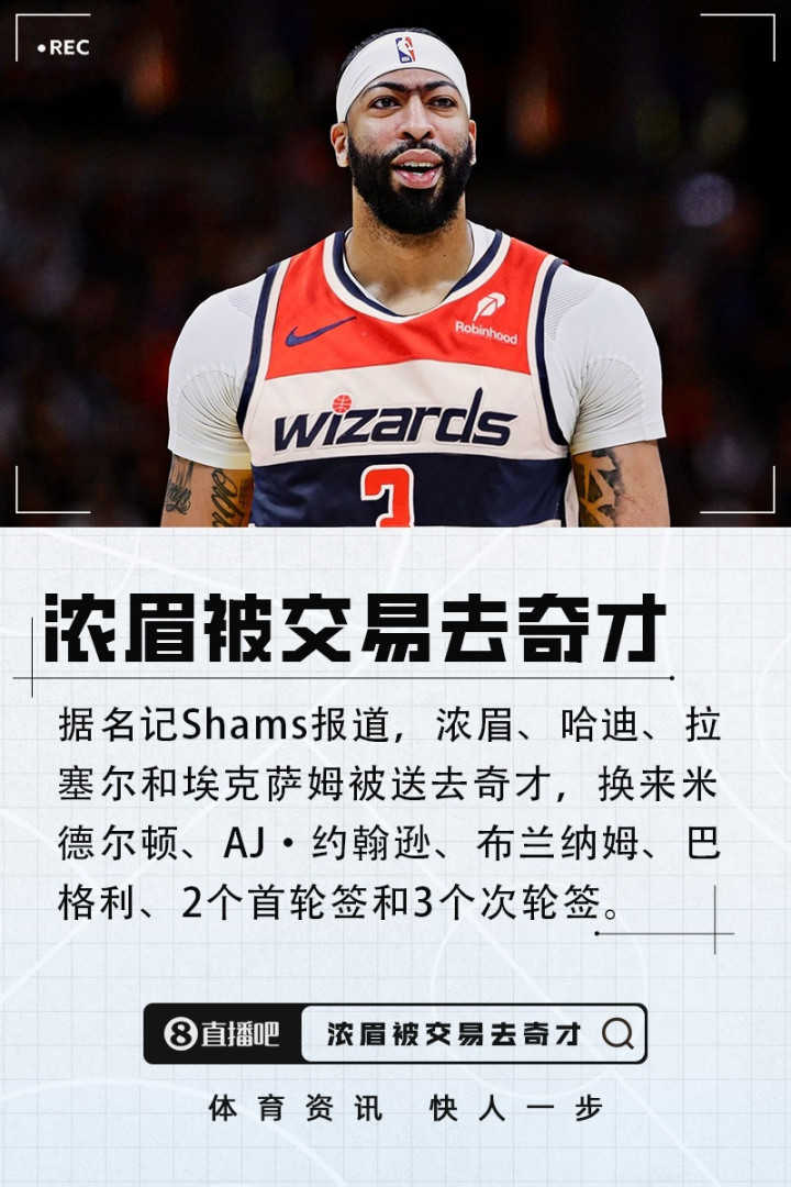 直播吧02月05日讯 据ESPN名记Shams Charania报说念,多位音书东说念主士自满,10届全明星球员安东尼·戴维斯(以下称浓眉)被独行侠往还去奇才。