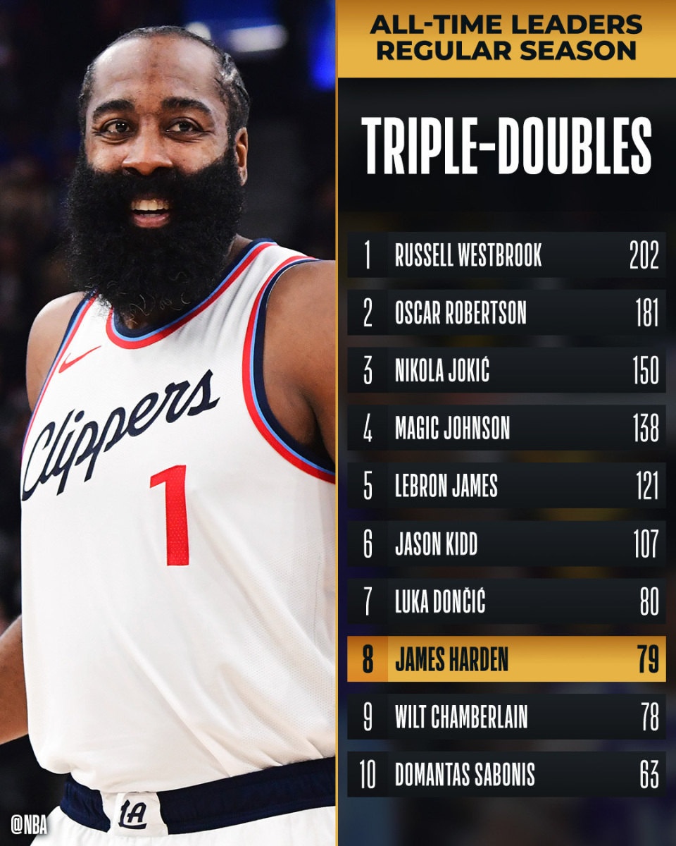 这么一来,哈登活命三双数据普及至79个,异常张伯伦独占历史第8,距离第七的东契奇仅差1次。