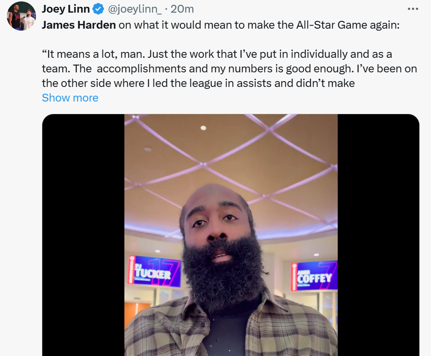 由于在本场比赛驱动前,NBA官方告示了东西部全明星首发东谈主选,哈登没能入选,需要在后续训导票选中竞争替补位置。